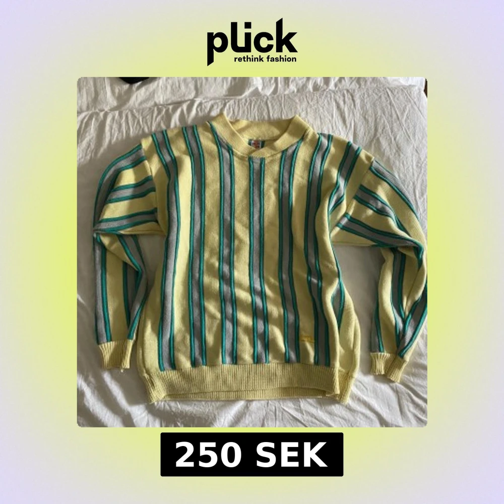 Retro stickad tröja från Loop i gult med vertikala ränder i grått/lila och turkost. Broderad Loop-logga nertill.Fint skick!❤️