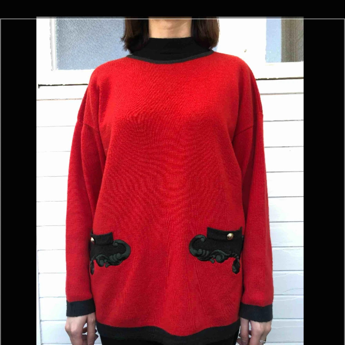 Röd vintage tröja med fickor från Moda styl. 70% ull och 30% akryl. Den är i bra begagnat skick och har inga hål eller fläckar. Den har svarta kanter. Den är gjord i Italien. Personen på bilden är 158 cm.