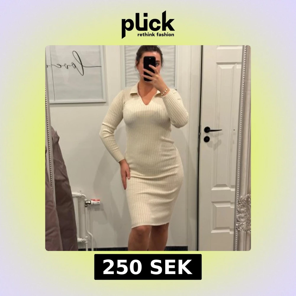 Säljer en ribbad beige stickad klänning med lång ärm och v-ringning med krage. Klänningen är figurnära och går till knäna, perfekt för dig som gillar en enkel men snygg look. Supermjuk och skön att bära. Passar L/M