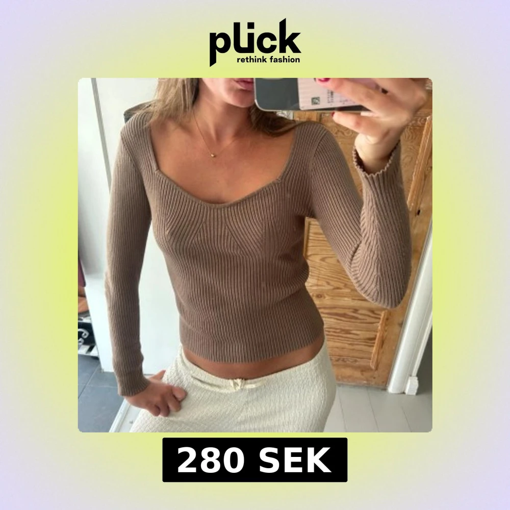 Snygg ribbad brun tröja med lång ärm och djup, rundad halsringning. Modellen är figurnära och har en stilren, enkel design som passar perfekt till jeans eller kjol. Materialet är stickat och ger en mjuk och skön känsla mot huden.