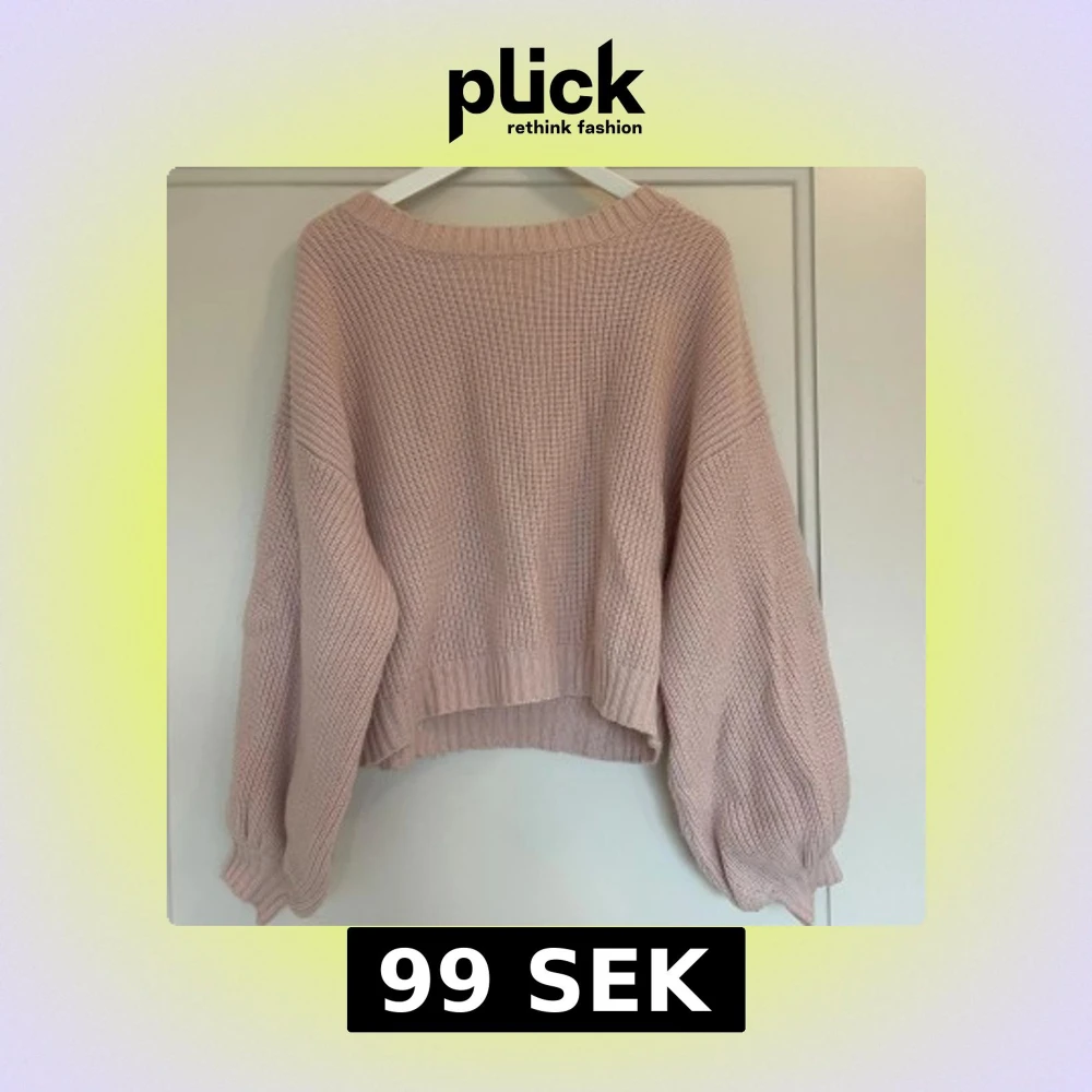 Mysig ljusrosa stickad tröja med öppen rygg. Ärmarna är i ”balong” stuk.