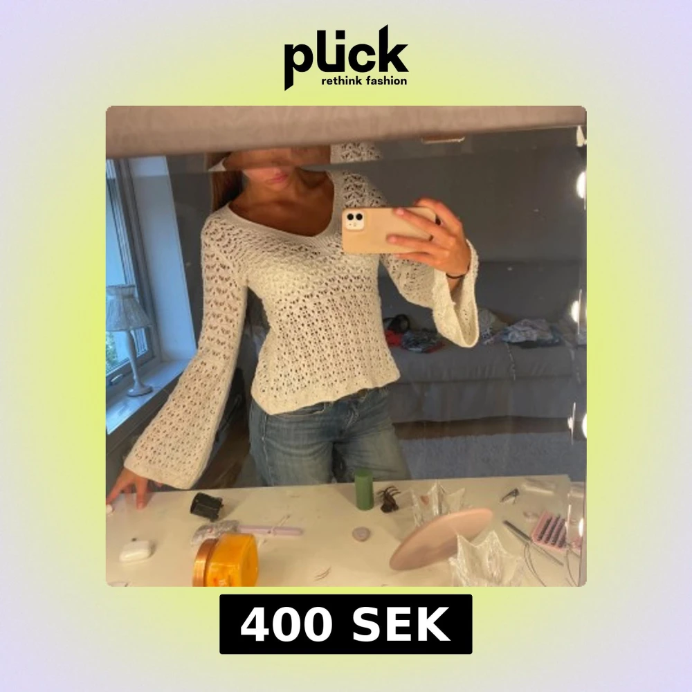 Superfin vit stickad tröja med v-ringning och utsvängda långärmar. Tröjan har ett luftigt hålmönster och sitter snyggt med en lite loose passform. Perfekt att styla med jeans eller kjol för en chill look.