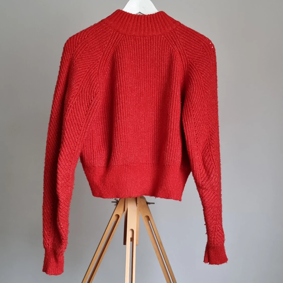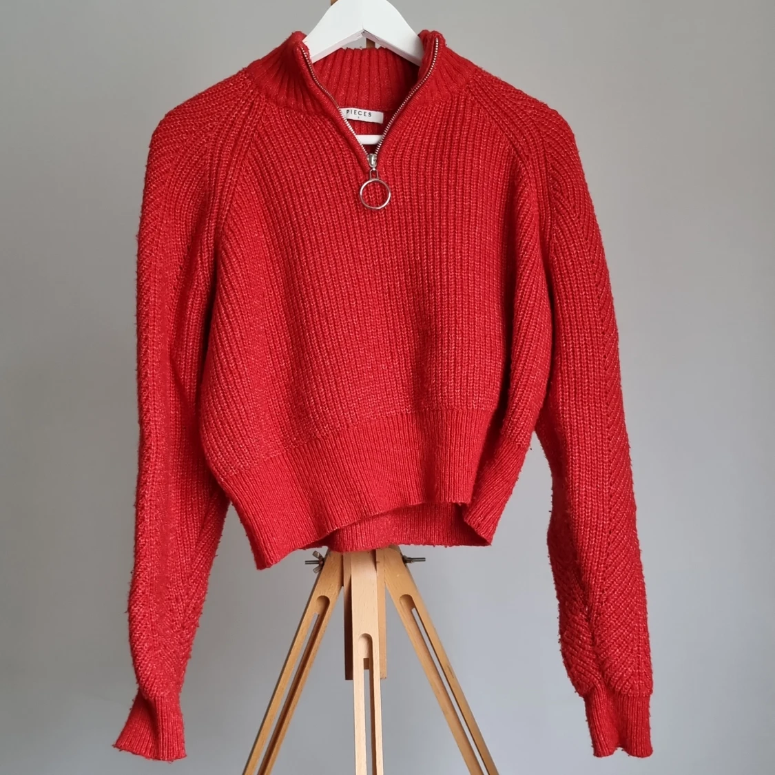 Stickad tröja med dragkedja, snygga detaljer i stickningen runt axel/arm. Långa ärmar och slutar strax nedanför naveln på mig