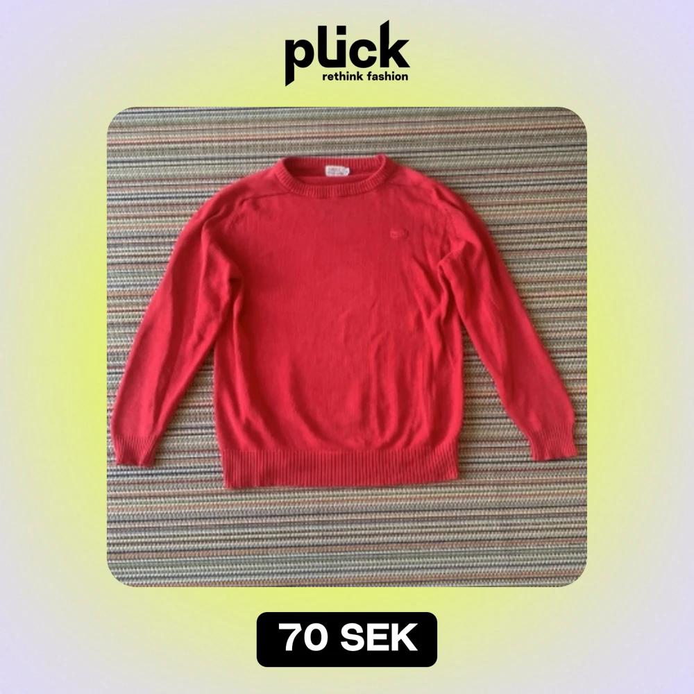 Röd stickad tröja som bara använts ett fåtal gånger. Den är dock köpt second-hand så lite tecken på användning finns, men i övrigt så är tröjan i bra skick