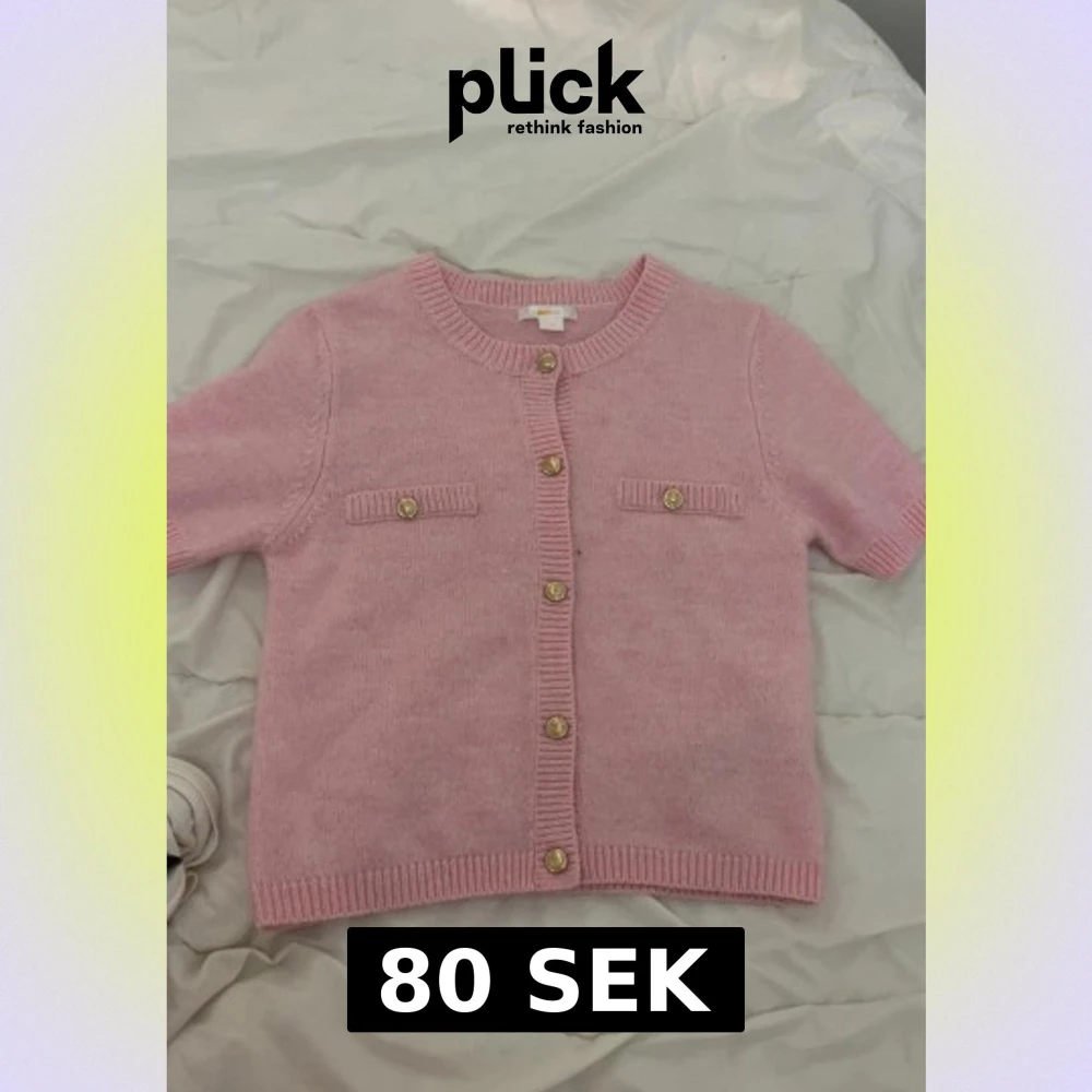 Söt rosa stickad kofta med korta ärmar och guldfärgade knappar framtill. Köpt på kids brandstore. Koftan har två dekorativa fickor på bröstet och ribbade kanter vid hals, ärmslut och nederkant. Super söt men kommer inte till användning