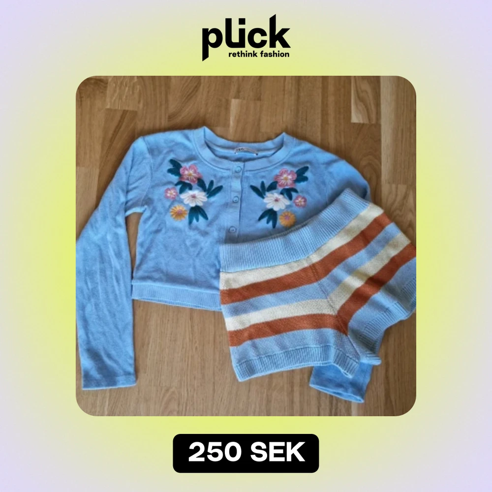 Säljer ett superfint stickat set från Zara i storlek S. Koftan har ett vackert blommigt broderi på framsidan och är croppad med långa ärmar. Shortsen är randiga och har en hög midja. De är i bra skick och mysiga att ha på sig 💐