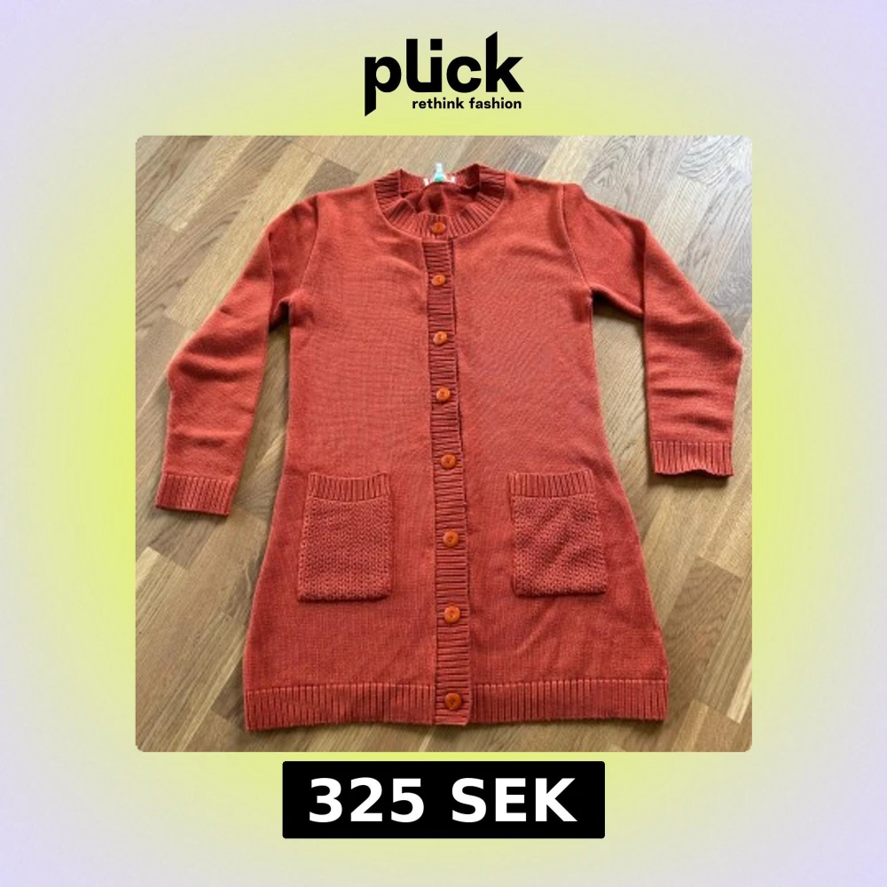 Lång, rostfärgad stickad cardigan med stora knappar framtill och två framfickor. Ribbstickade muddar vid ärmslut, hals och knappslå. Perfekt för lager-på-lager och enkel att styla.
