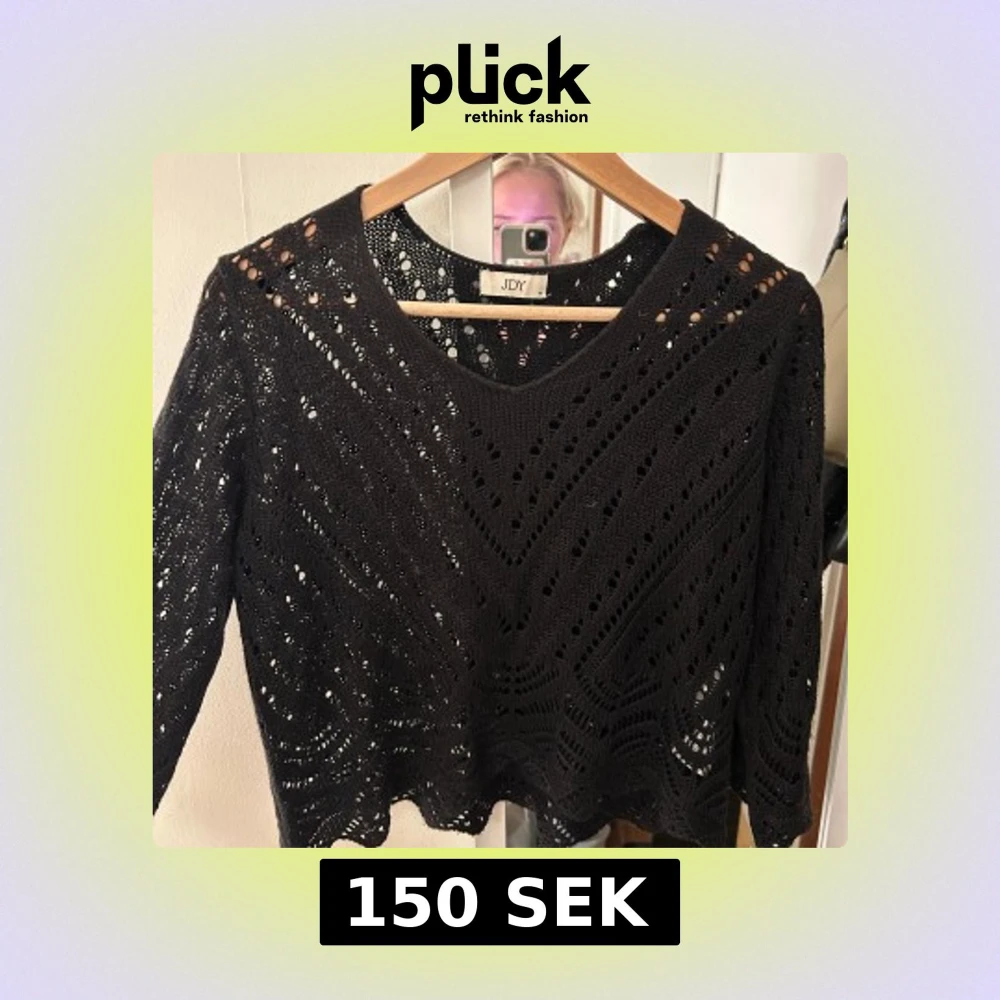 Svart stickad tröja med hålmönster och croppad passform. Tröjan har trekvartsärmar och en snygg vågig kant nertill. Perfekt att styla med jeans eller kjol för en cool look.
