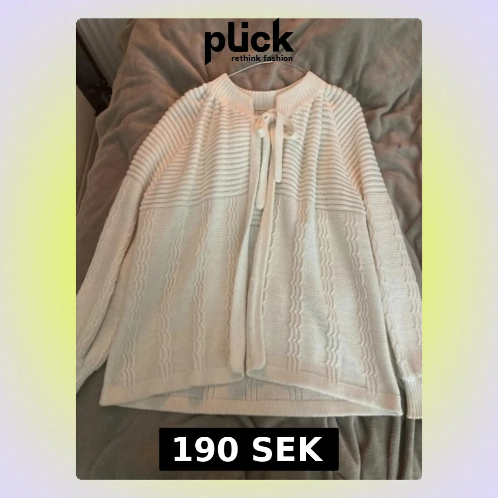 Superfin vit stickad kofta med snygga strukturerade ränder och vågiga detaljer. Koftan har lång ärm och ett brett ribbat parti upptill samt ett knytband vid halsen för extra stilpoäng. Den har ingen lapp var den kommer ifrån eller vilken storlek men skulle säga S/M.