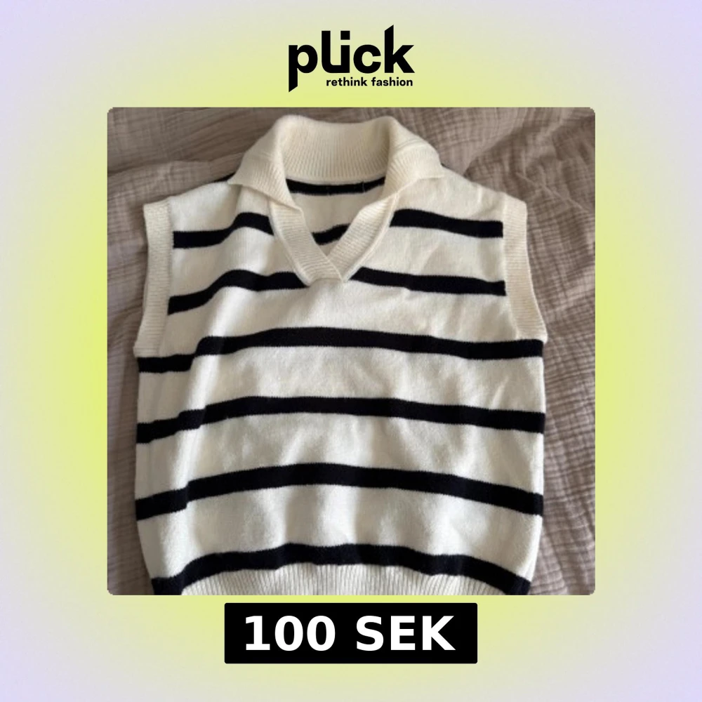 Snygg stickad väst i vitt med svarta horisontella ränder och en bred, ribbad krage. Västen är ärmlös och har en v-ringad halsringning. Perfekt att styla över en skjorta eller t-shirt för en trendig look.