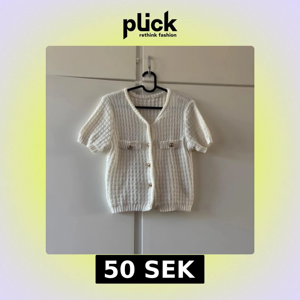 Säljer en vit stickad kofta med korta ärmar och snygga guldfärgade knappar framtill. Koftan har två dekorativa fickor på bröstet och ett ribbat mönster som ger en cool textur. Perfekt för dig som gillar en chill och trendig look.