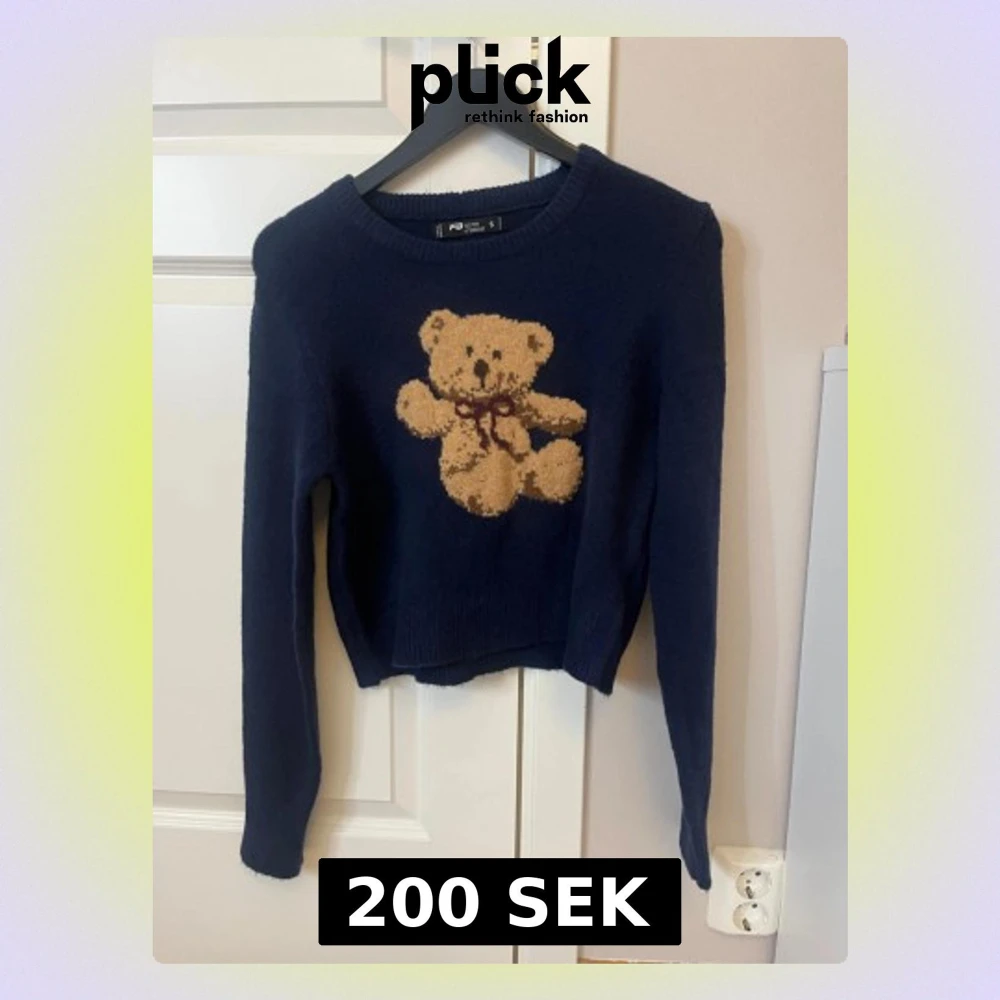 Säljer en helt ny mörkblå stickad tröja i storlek S, utan prislapp men har aldrig använt❤️ Jätte söt teddy framtill med söt rosett💘