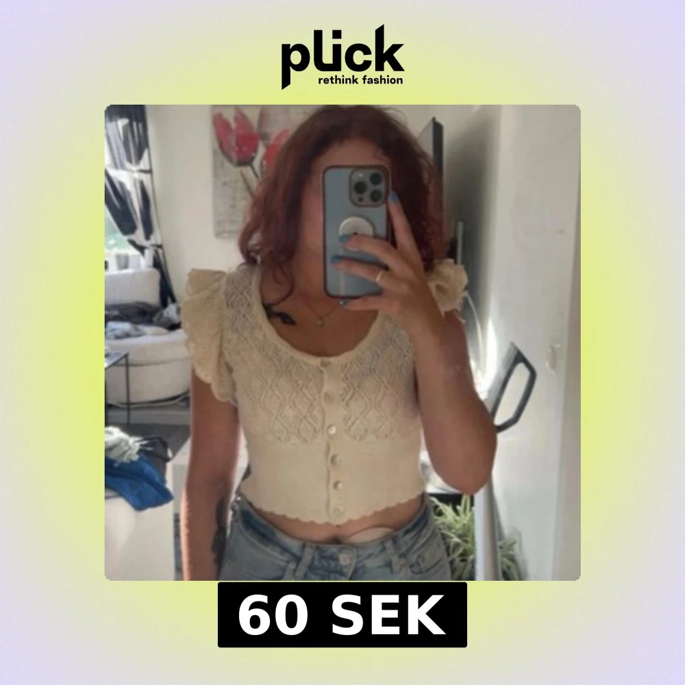 Superfin beige/vit stickad blus med korta volangärmar och snyggt mönster. Croppad modell, använd fåtal gånger och är i fint skick. Den är från dilvin knit men det står ingen storlek i, jag som tagit bilden har vanligtvis storlek s i tröjor