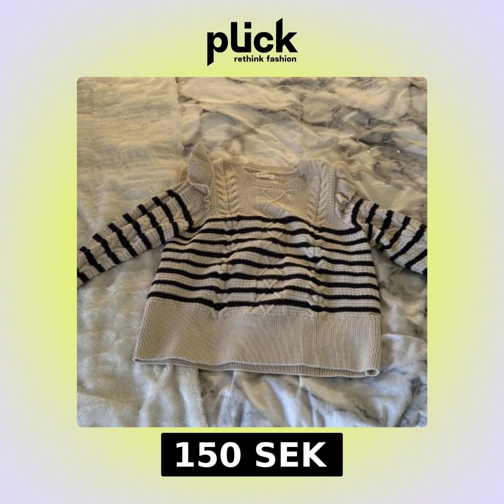 Säljer en snygg randig stickad tröja från Holly & Whyte. Tröjan har volangdetaljer vid axlarna och ett flätat mönster framtill. Den är beige med svarta ränder och har långa ärmar. Perfekt för en stilren look!