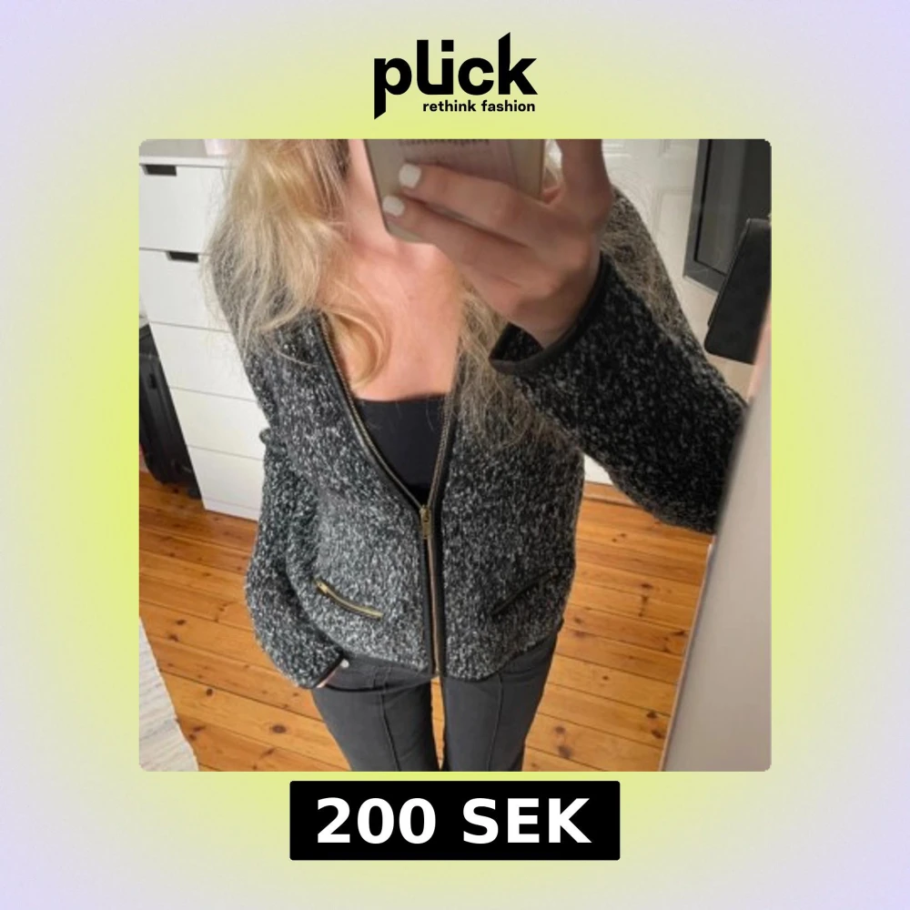 Snygg grå stickad kofta med dragkedja och två fickor med gulddetaljer. Perfekt för kyliga dagar och enkel att matcha med olika outfits.