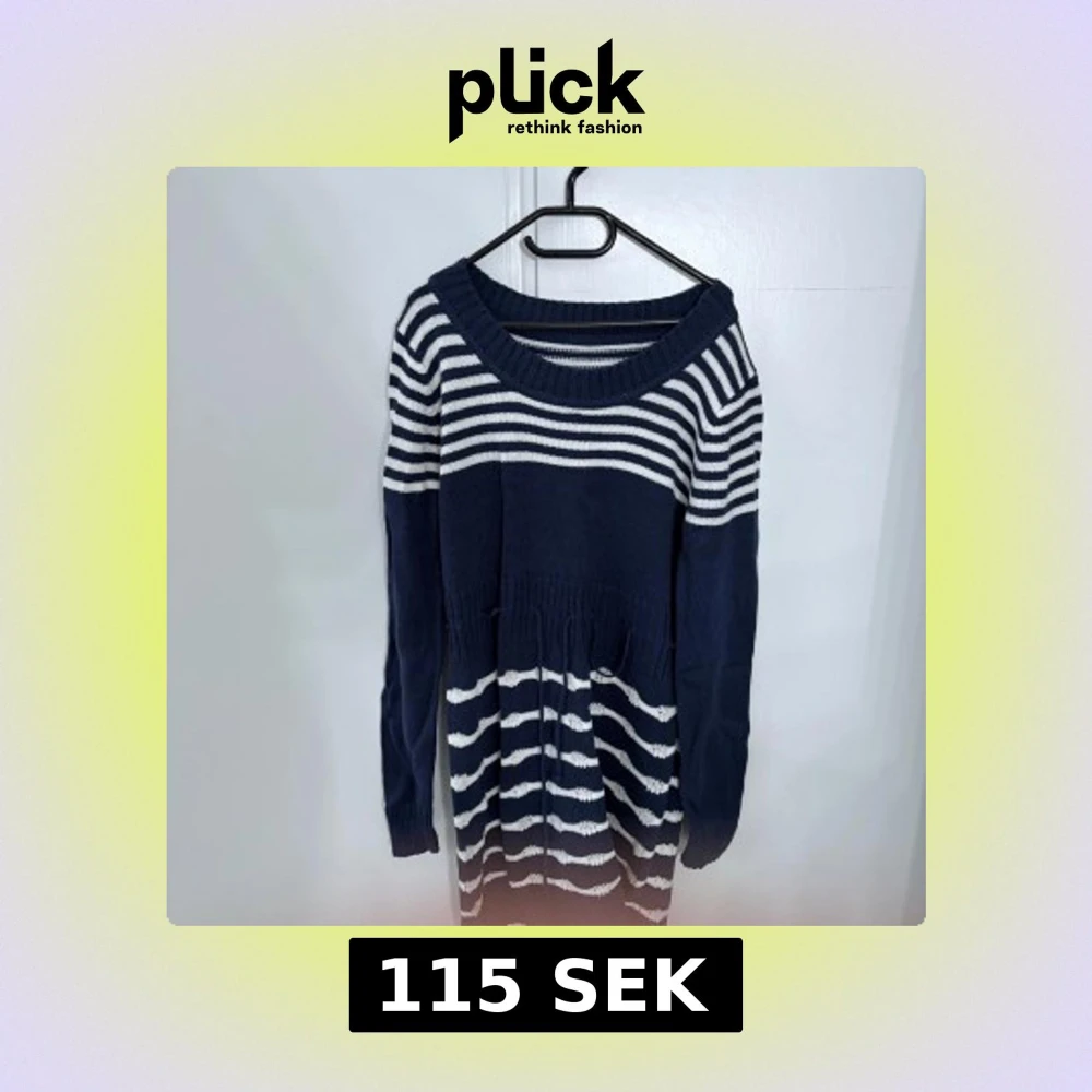 Supermysig stickad klänning i marinblått och vitt med breda ränder upptill och smalare ränder nertill. Långärmad med rund halsringning och markerad midja. Perfekt för kyligare dagar och enkel att styla med boots eller sneakers.
