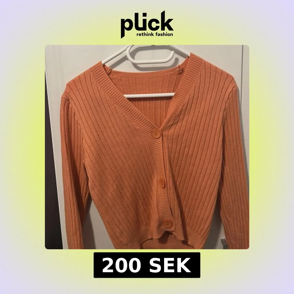 Snygg ribbad kofta i en varm orange/koral färg med v-ringning och stora matchande knappar framtill. Långärmad och i mjukt stickat material, perfekt att slänga på sig över ett linne. Enkel och stilren design som funkar året runt. Står inte vart den är ifrån💕