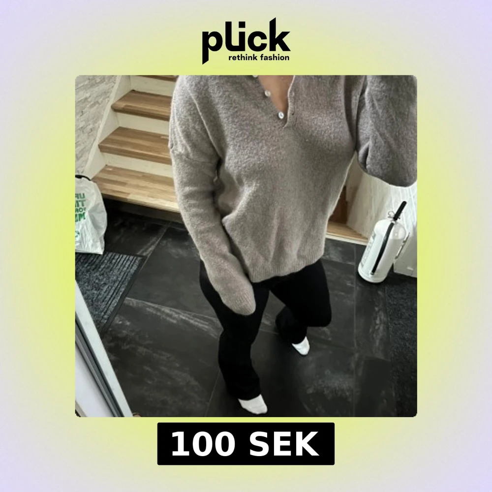 Mysig beige stickad tröja med krage och tre knappar framtill. Tröjan har lång ärm och en relaxed passform. Ribbstickade muddar vid ärmslut och nederkant.