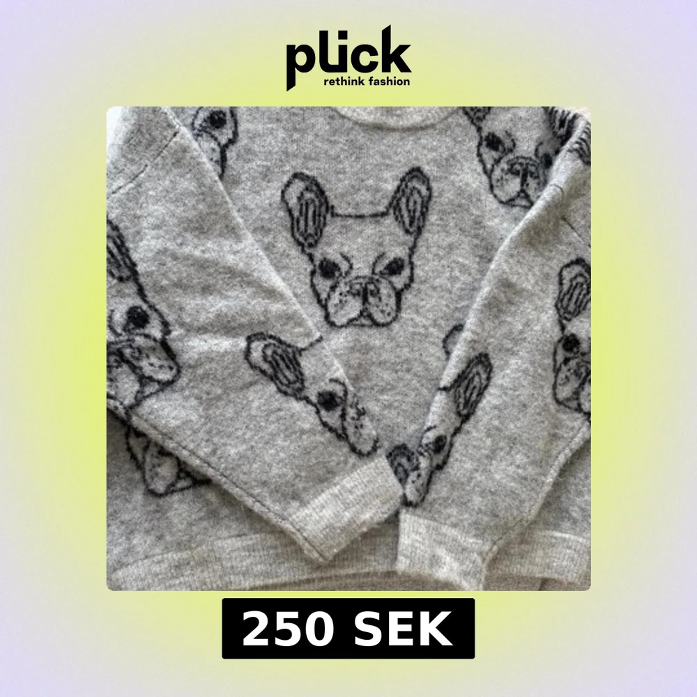 Supermjuk grå stickad tröja med stora svarta bulldog-ansikten över hela plagget. Tröjan har rund halsringning och långa ärmar, perfekt för dig som gillar unika och gulliga motiv🩵