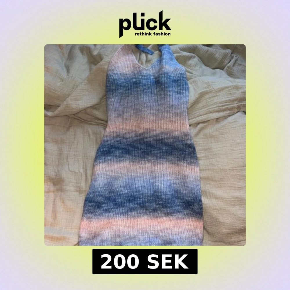Säljer en stickad klänning med vackra övergångar i blå och rosa toner. Klänningen har en halterneck-design och är ärmlös, vilket ger en somrig känsla. Perfekt för en avslappnad dag ute eller en mysig kväll hemma.