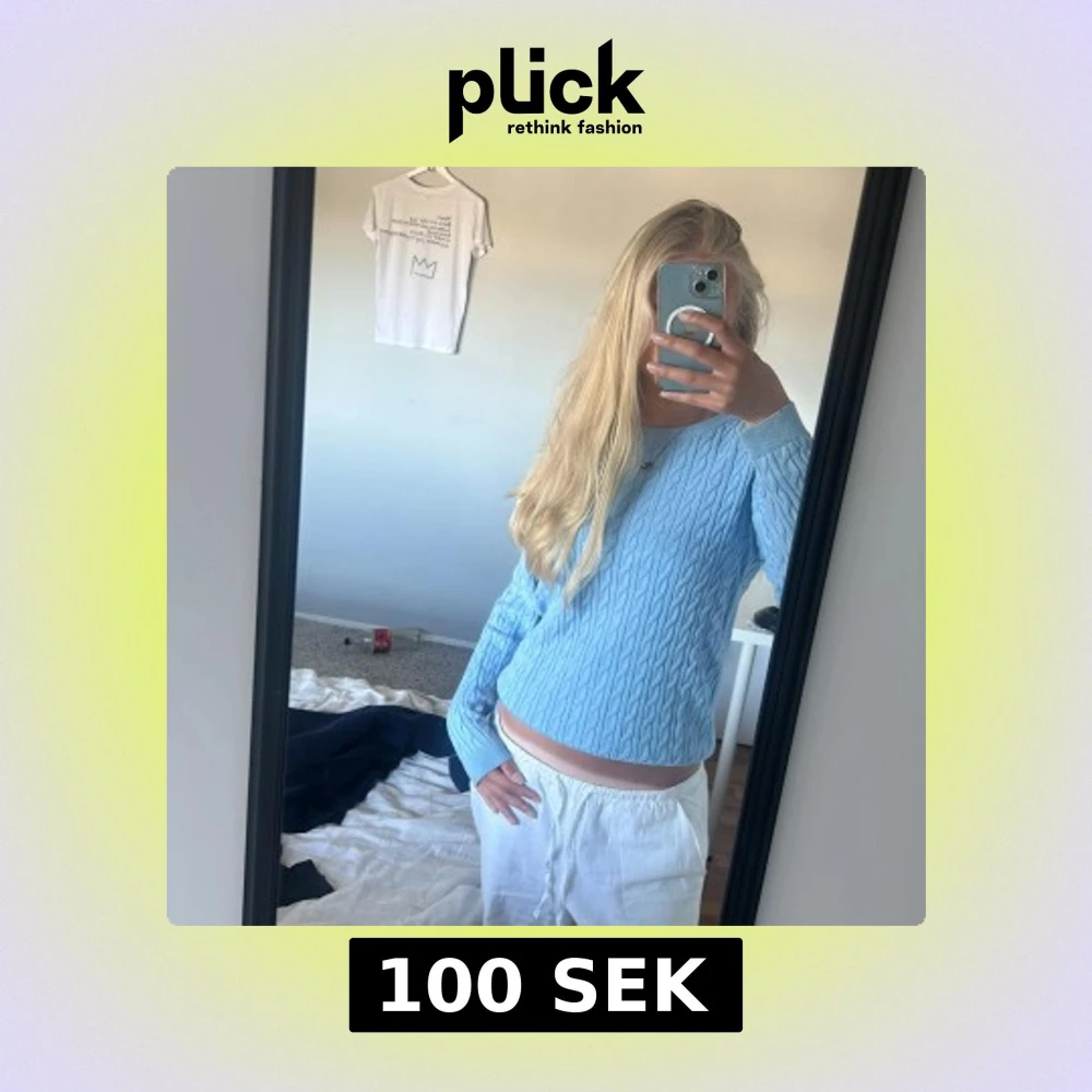 Supersöt ljusblå kabelstickad tröja med rund hals och långa ärmar. Sitter snyggt med normal passform. Perfekt att styla med jeans eller kjol för en fräsch look. Använd max 3 ggr