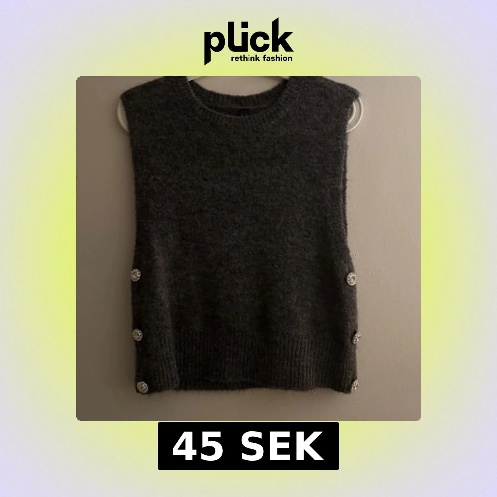 Mysig mörkgrå stickad väst med rund halsringning och bred ribbad kant nedtill. Sidorna är dekorerade med stora, blommiga knappar i silver med glittriga stenar som ger en extra touch. Har använt 2-3 gånger.
