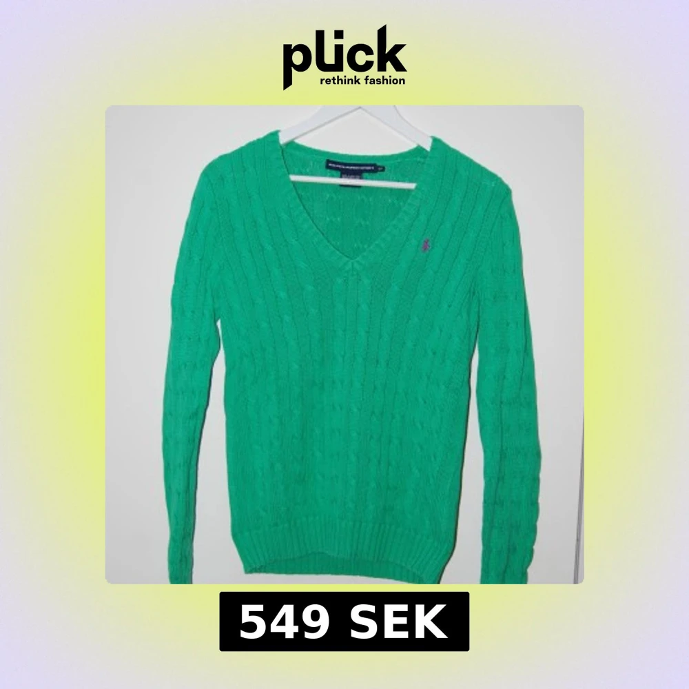 Säljer en snygg grön stickad tröja från Ralph Lauren med en lila broderad logga på bröstet. Tröjan har en v-ringad design och långa ärmar, perfekt för en stilren look. Den är i mycket bra skick och gjord i ett väldigt mjukt och bekvämt material. Den är i storlek S