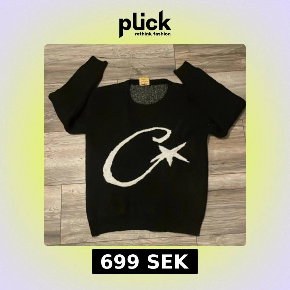 Cool svart stickad tröja från PVS i storlek S. Framsidan har en stor vit grafisk design med en stjärna och ett C. Tröjan har rund hals och långa ärmar, perfekt för att ge din outfit en unik touch.