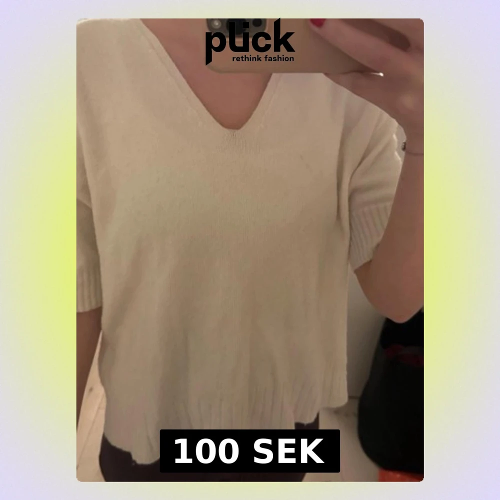 Mysig beige stickad tröja med v-ringning och korta ärmar. Tröjan har ribbade detaljer vid ärmslut och nederkant, vilket ger en snygg och enkel look. Perfekt att slänga på sig när det är lite kyligt ute.
