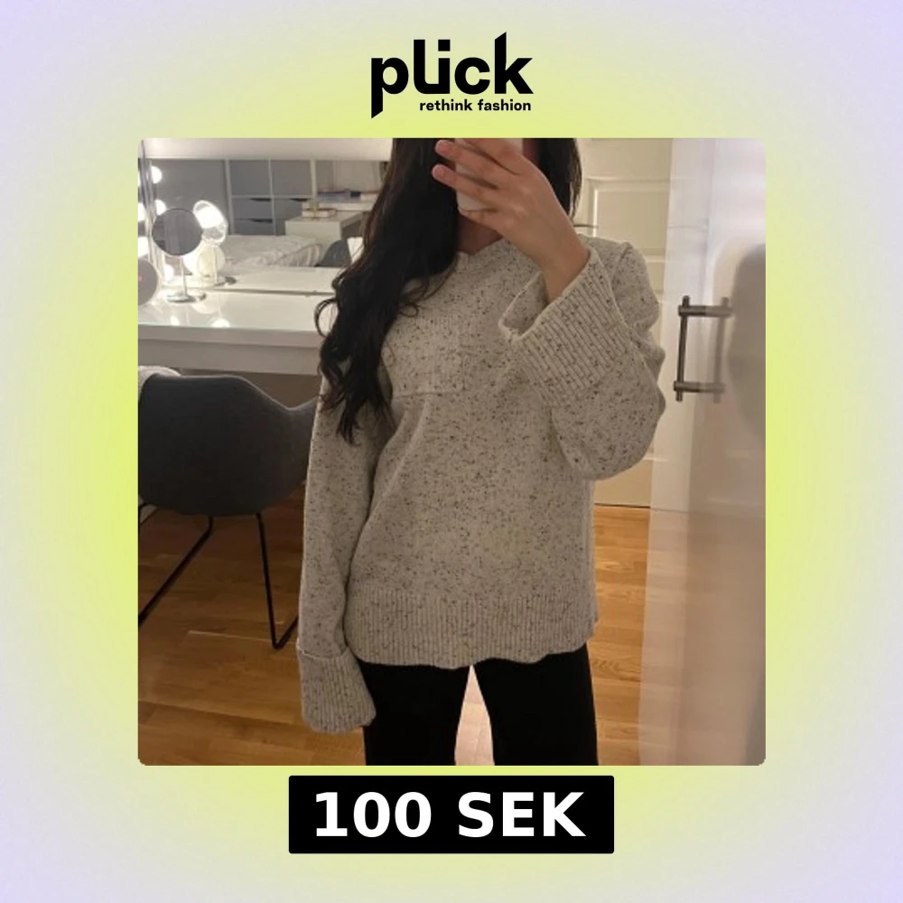 Mysig grå stickad tröja med en liten ficka på bröstet. Tröjan har långa ärmar och ribbade kanter vid ärmslut och nederkant. Perfekt för kyliga dagar!