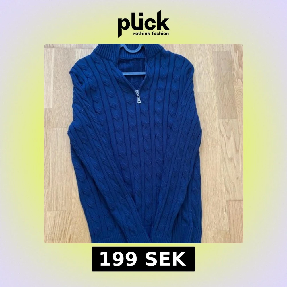 Säljer en marinblå stickad tröja med kabelstickat mönster och half zip i halsen. Tröjan har hög krage och långa ärmar, perfekt för kyliga dagar. Snygg och klassisk modell som passar till det mesta.