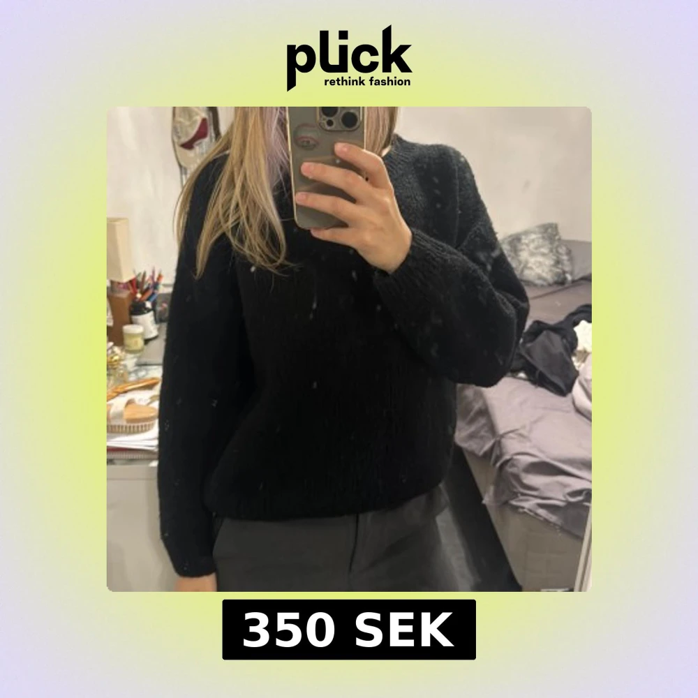 Mysig svart stickad tröja med rund halsringning och långa ärmar. Tröjan har en enkel och klassisk design med ribbade muddar vid ärmslut och nederkant. Perfekt att slänga på sig när det är kyligt ute.