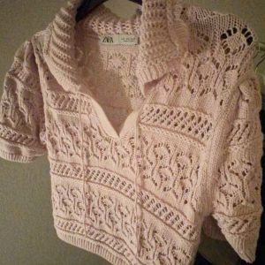 Rosa kofta från  med hålmönster - Säljer en rosa stickad kofta från ONLY med snyggt hålmönster och knappar framtill. Koftan har v-ringad hals och trekvartsärmar, perfekt att slänga över en topp. Materialet är mjukt och lätt stickat, vilket gör den skön att bära under vår och sommar.
