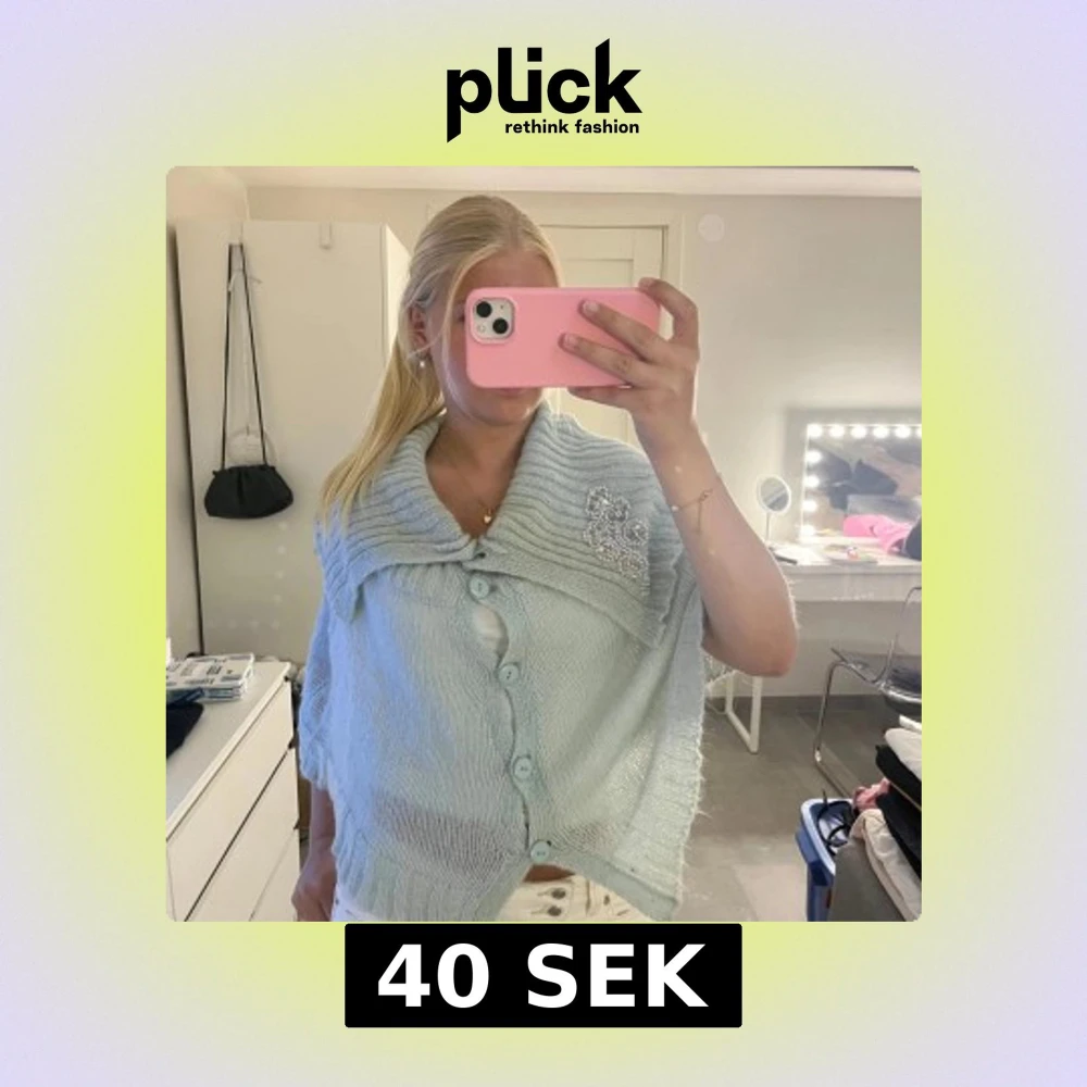 Superfin ljusblå stickad kofta med stora ribbade krage och knappar framtill. Koftan har en unik pärlbroderad detalj på kragen och är lite loose i modellen med kortare ärmar. Perfekt att slänga över en topp för extra mysig stil.