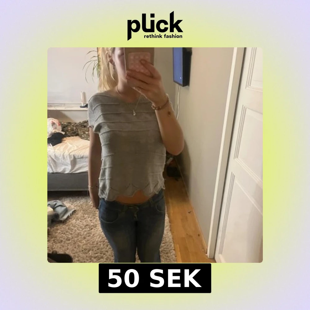 Säljer en grå stickad topp med kort ärm och croppad passform. Toppen har vågig nederkant och ett diskret randigt mönster i stickningen. Perfekt till jeans eller kjol för en chill look. Tröjan har ingen lapp så vet inte storlek men chansar på s eftersom jag brukar ha det.