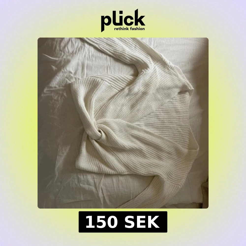 Superfin vit stickad kofta i omlottmodell med snygg knut framtill. Tröjan har långärmade ärmar och ribbade muddar, perfekt att slänga på sig över ett linne eller t-shirt. Mjuk och skön, passar till både jeans och kjol.