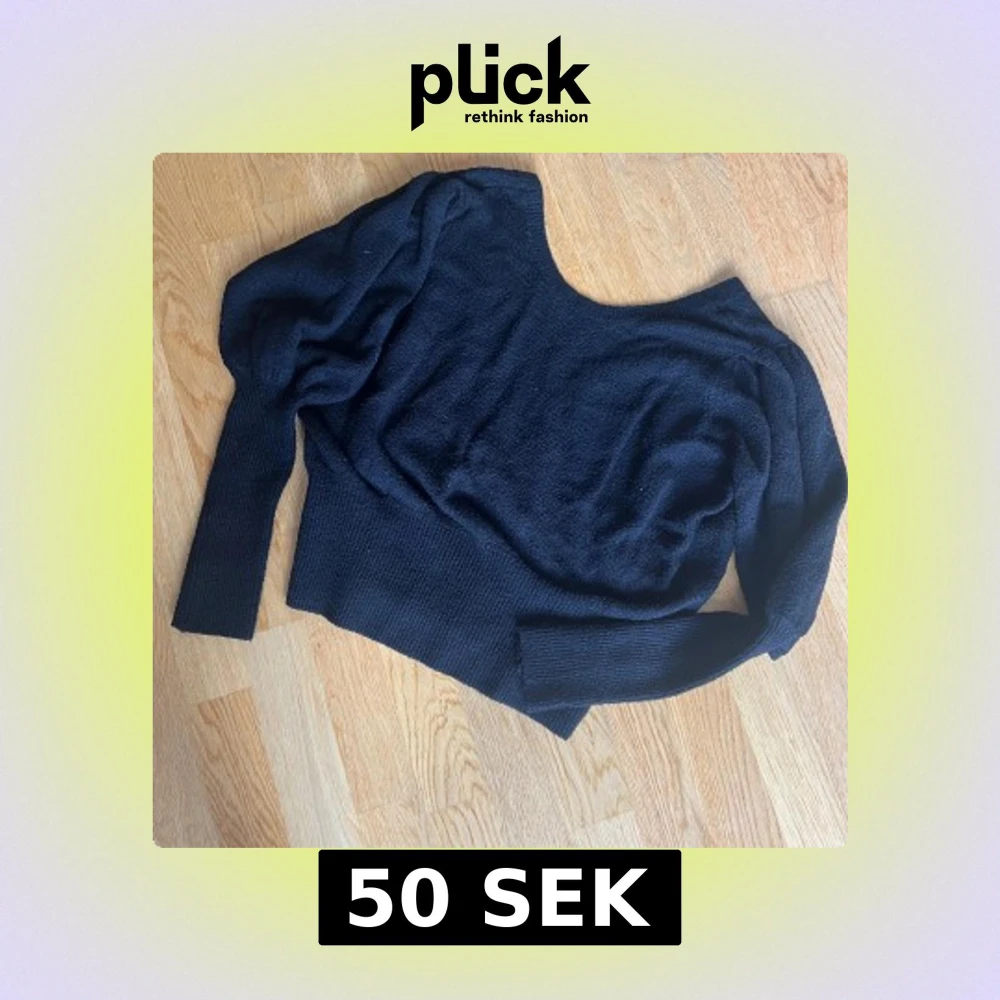 Snygg svart stickad tröja från Ivyrevel med urringad omlottdetalj baktill och bred ribbad kant nedtill. Tröjan har långärmade puffärmar och en djupare rund halsringning.