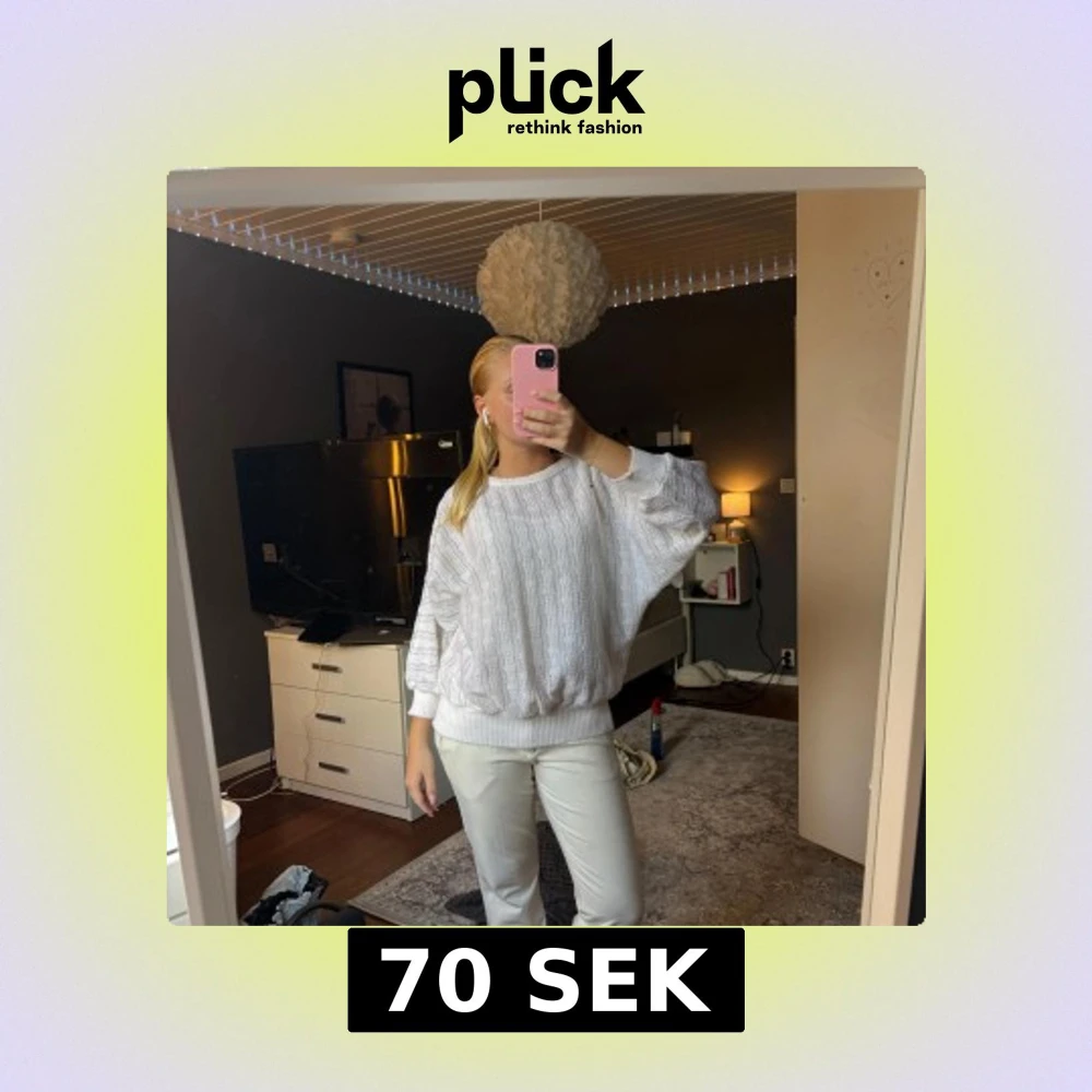 Säljer en vit stickad tröja med snyggt strukturmönster och breda muddar. Tröjan har en loose passform och långa ärmar, perfekt för lager-på-lager. Supermjuk och skön att ha på sig, passar till allt och är lätt att styla. Finns inget märke på den men har köpt den i Polen second hand