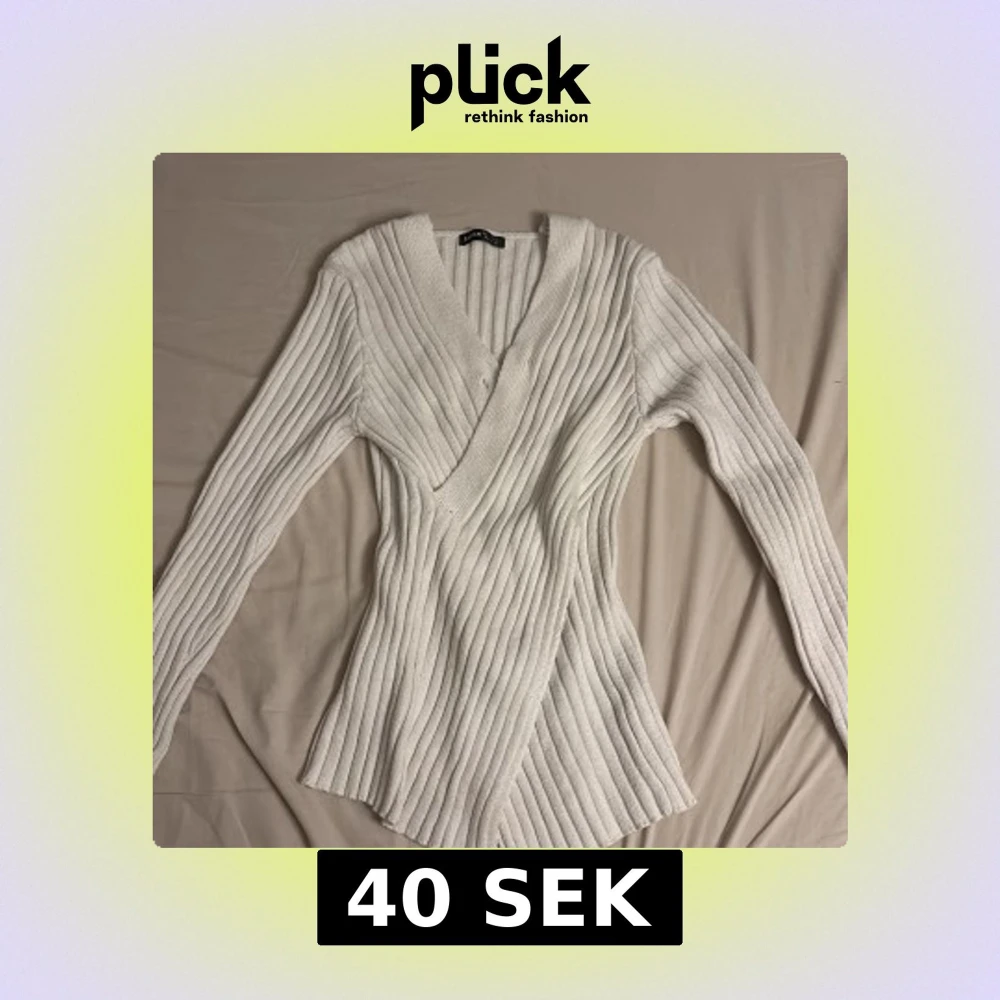 Säljer en vit ribbad omlott tröja från SHEIN. Tröjan har lång ärm, markerad midja och djup v-ringning. Den är stickad i mjukt material och passar perfekt för lager-på-lager-stil. Enkel att matcha med jeans eller kjol.