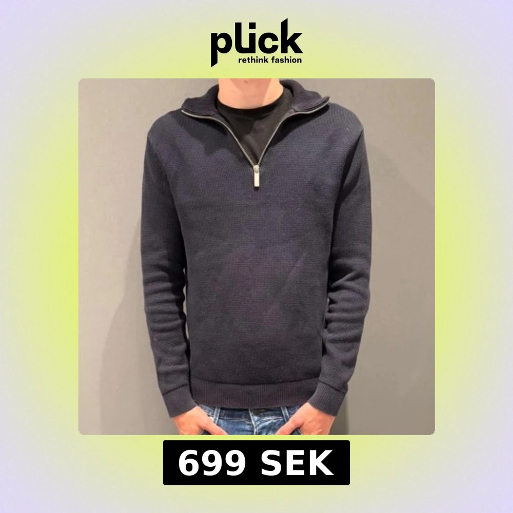 Säljer en mörkblå stickad tröja med half zip och hög krage. Tröjan har lång ärm, ribbade muddar och en clean, stilren look som passar perfekt till jeans. Skön och lite tjockare kvalitet som håller värmen under kyliga dagar.