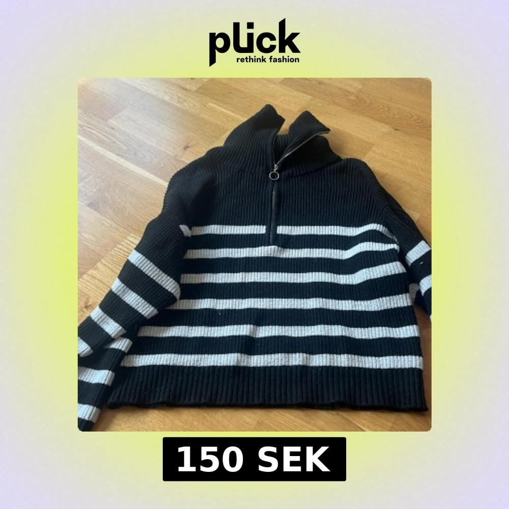 Säljer en svart och vit randig stickad tröja från Pimkie. Tröjan har ribbad struktur, hög krage och en snygg half zip-dragkedja med ringdetalj. Perfekt för dig som gillar en chill och trendig stil med lite oversized känsla.
