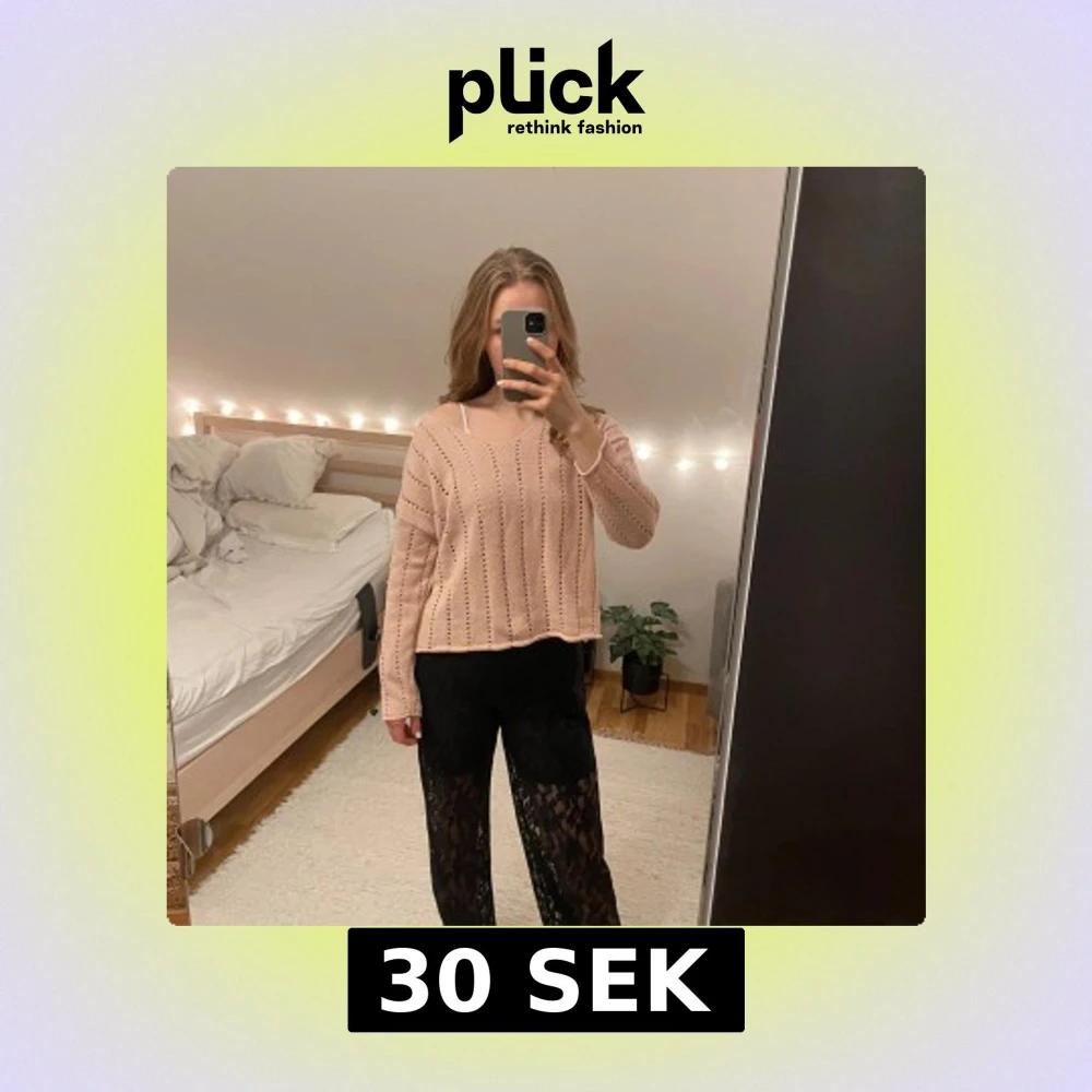 Säljer en rosa stickad tröja med hålmönster och v-ringning. Tröjan har långa ärmar och en avslappnad passform, perfekt för mysiga dagar. Stl S/M