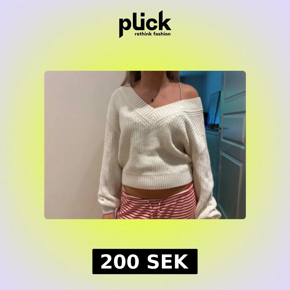Säljer en vit croppad stickad tröja med bred v-ringning och offshoulder-design. Tröjan har långa ärmar och ribbad struktur som ger en snygg och avslappnad look. Perfekt för dig som gillar trendiga och bekväma plagg med lite edge.