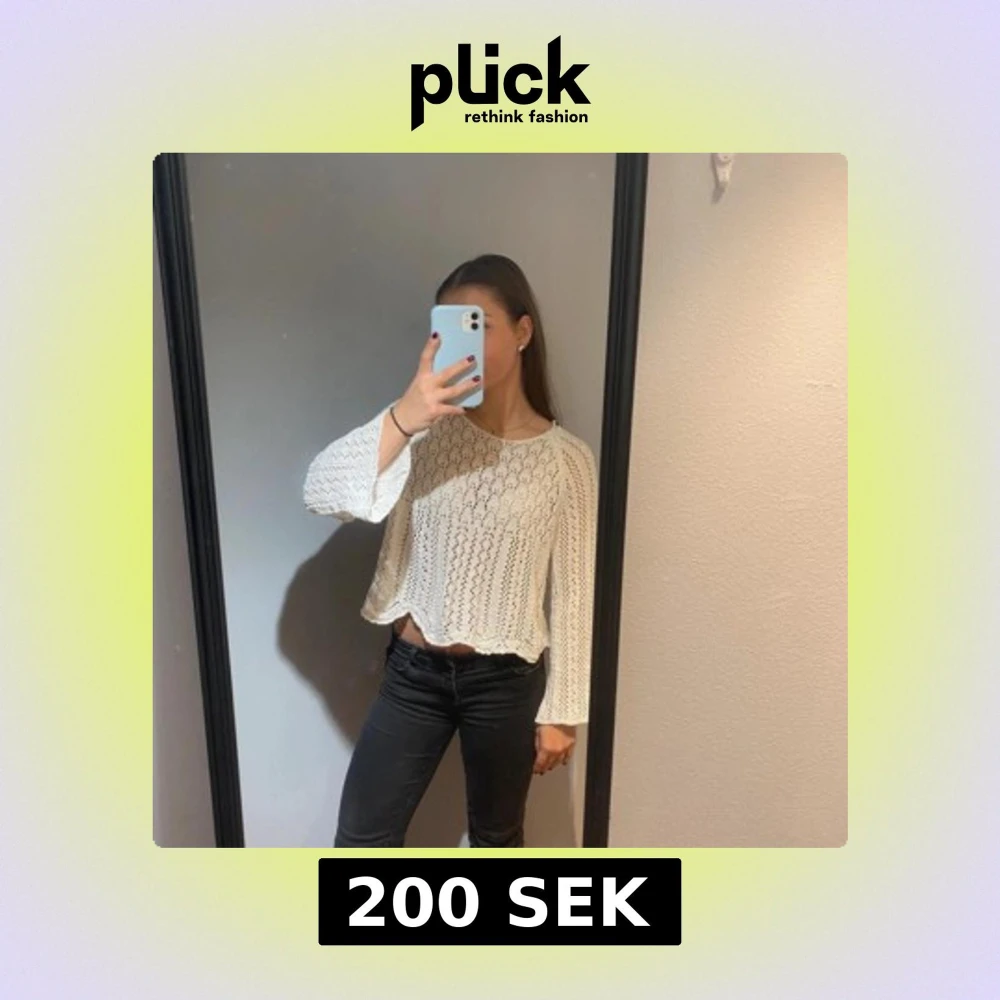 Säljer en vit stickad tröja med lång ärm och snyggt hålmönster. Tröjan har en vågig kant nedtill med en loose passform. Perfekt för dig som gillar en chill och trendig stil. Passar till både jeans och kjol. Använd fåtal gånger