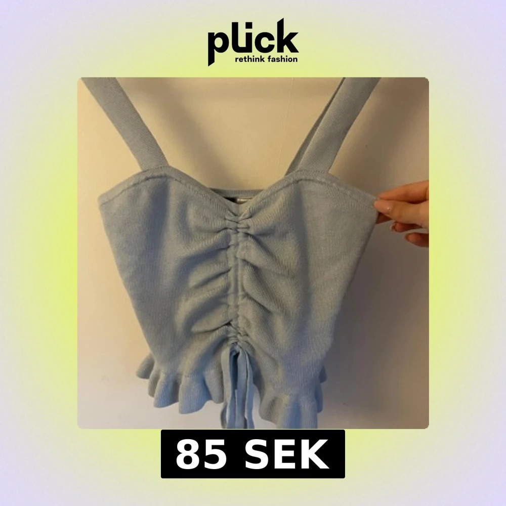 Supersöt ljusblå stickad linnetopp från H&M Divided. Toppen har breda axelband, rynkade detaljer med snörning framtill och volangkant nertill. Perfekt för en trendig och somrig look!