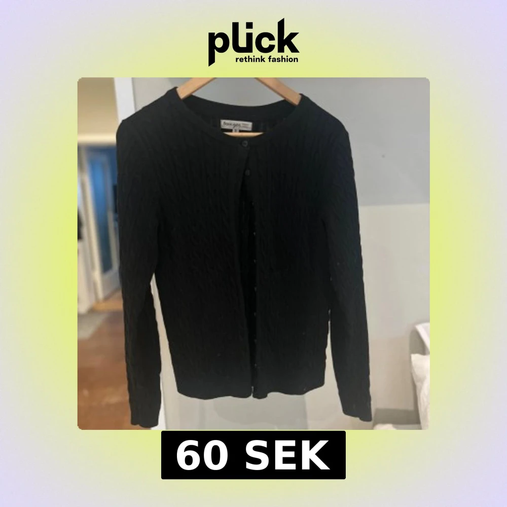 Använd väldigt få gånger. Men som ny i skicket. Svart kabelstickad kofta från Basic You i ekologisk bomull. Klassisk rund halsringning, knäppning framtill med svarta knappar och långärmad modell. Perfekt att slänga över en t-shirt eller linne för en chill look. 🥰🥰