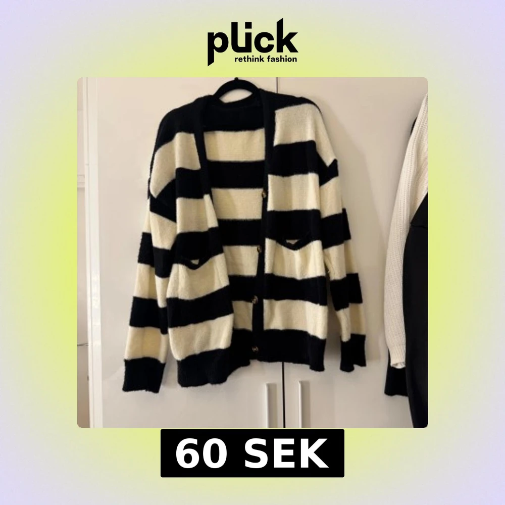 Mysig kofta med breda svarta och vita ränder. Den har knappar framtill, två fickor och är stickad i ett mjukt material.