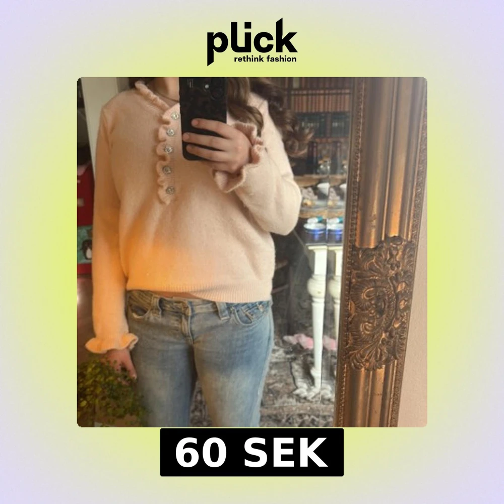 Mysig rosa stickad tröja med dekorativa knappar framtill. Tröjan har långa ärmar och en fin volangdetalj vid knäppningen.