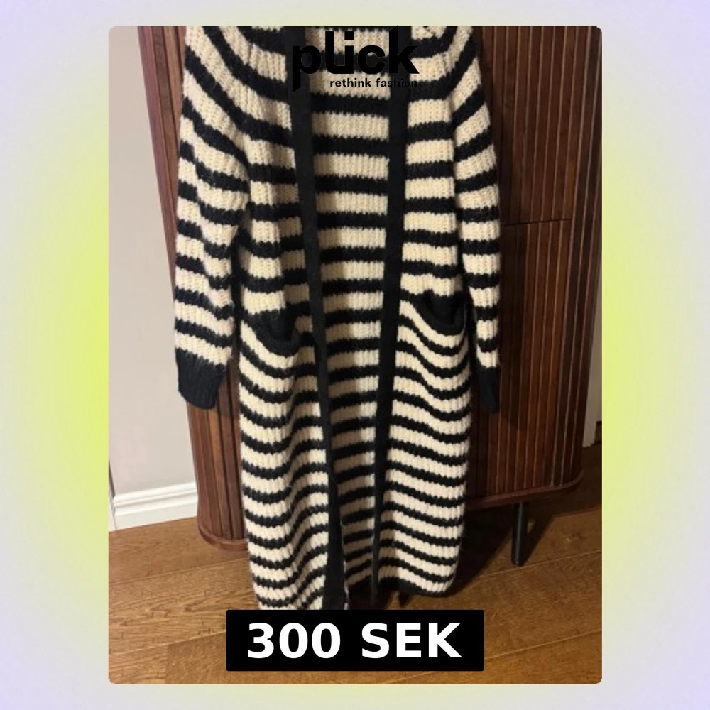 Säljer en lång, mysig kofta från Object i storlek S. Koftan är stickad med breda svarta och vita ränder, har två fickor framtill och ribbade muddar vid ärmslut.