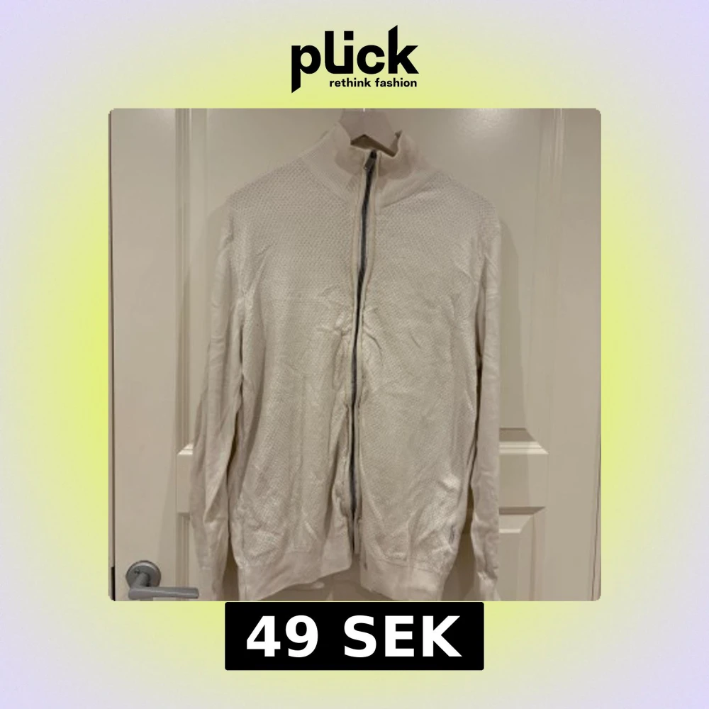 Säljer en beige stickad kofta med hög krage och hel dragkedja framtill. Tröjan har ett diskret prickigt mönster i stickningen och ribbade muddar vid krage, ärmslut och nederkant. Perfekt för lager-på-lager och chill stil.